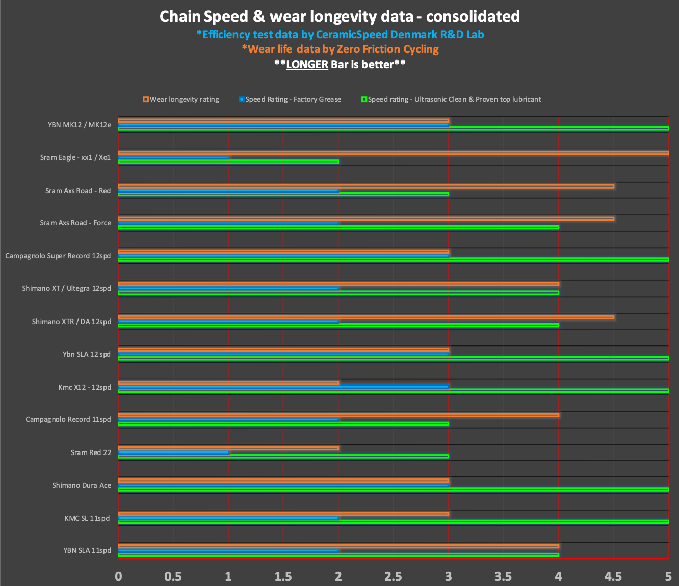 The graph above shows chain efficiency data represented by the green bar. It is also important to note that the orange bar displays the chain longevity rating. Based upon the data from Zero Friction Cycling, we can conclude the following: