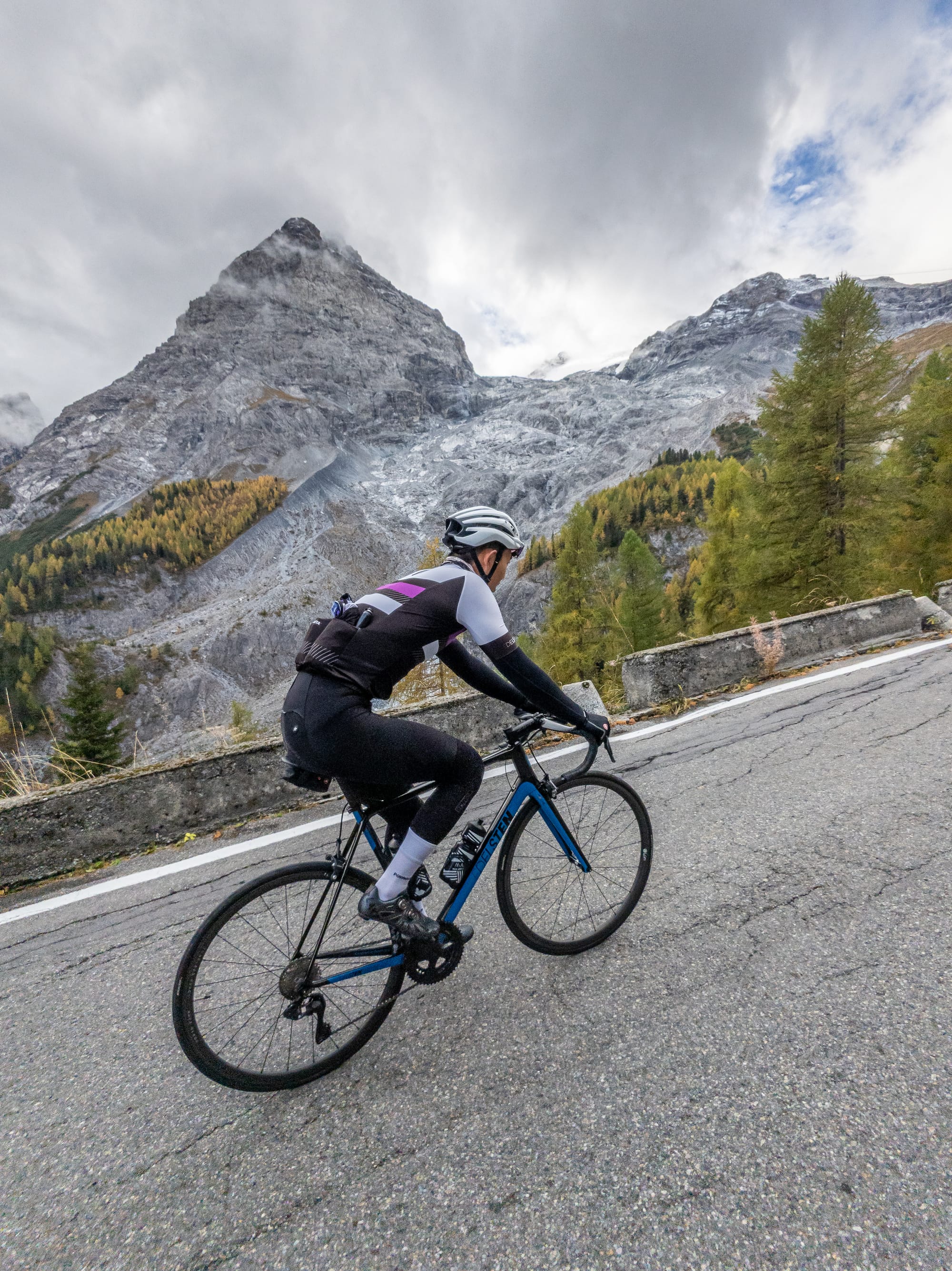 I first ascended Stelvio in October of 2023 with two of my closest cycling friends. On this day, we had the intention of climbing all three sides of Stelvio. The three of us started in Prato and rode past the painted totem poles on the right hand side of the road marking the start of the climb. In this moment, I was both excited and nervous for what lay ahead. (I had climbed some giant Alpine climbs prior, but nothing in comparison to Passo Stelvio.)